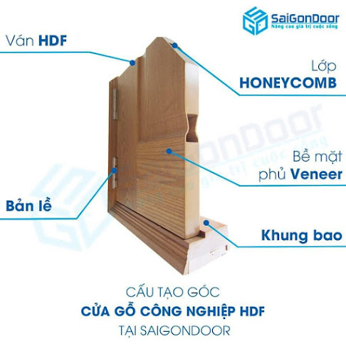 Cửa HDF được làm từ 3 lớp: Khung xương bằng gỗ tự nhiên chống cong vênh, co ngót, mối mọt; 2 tấm HDF được định hình theo panel cửa và lớp ngoài cùng được phủ sơn NC hoặc sơn PU để giữ độ bền cho cửa và tạo sự thẩm mỹ.